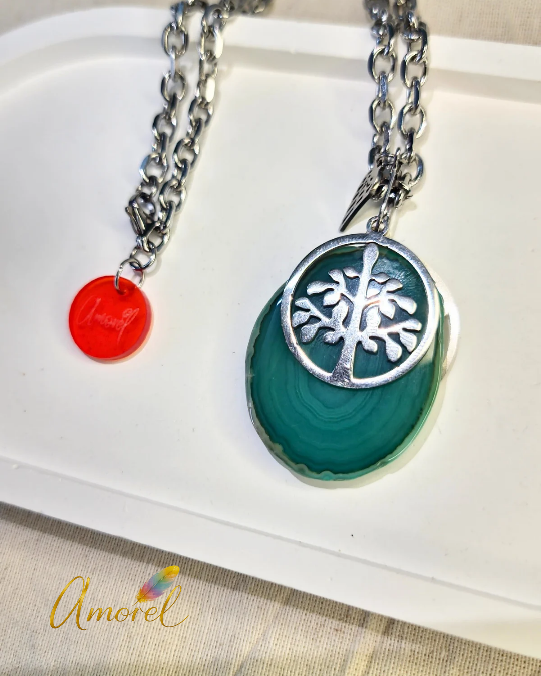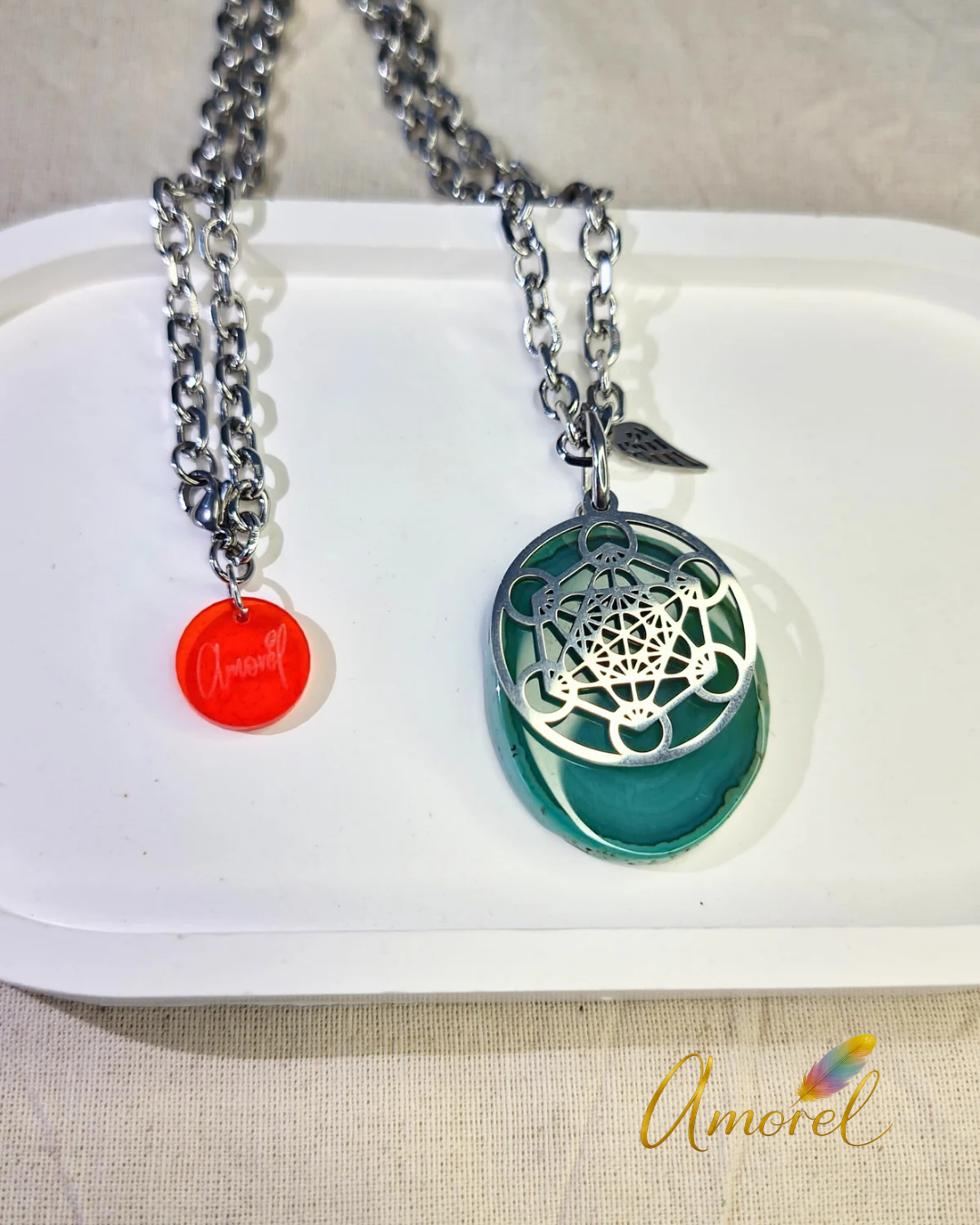Utilizamos materiales de calidad para su composición: cadena de acero, alita de acero, accesorios de acero, y las piedras en este modelo son Ágatas naturales con baño de plata en el borde. Cada pieza incluye también un dije con el lo de Amorél.