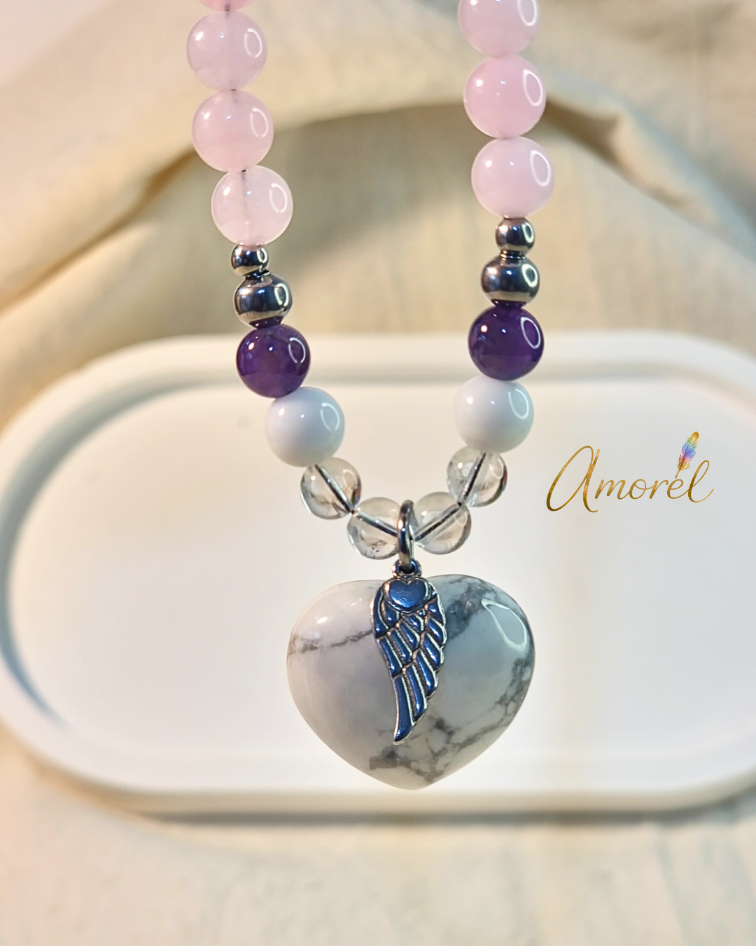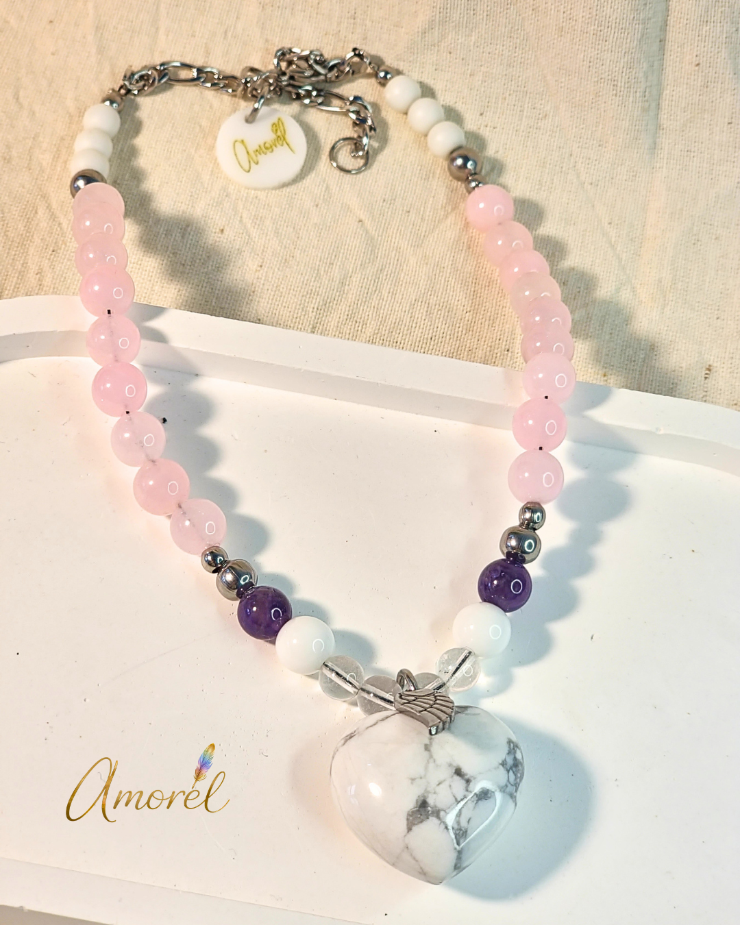 Con howlita, cuarzo rosa, amatista y ónix blanco, esta pieza acompaña procesos de calma emocional, apertura del corazón y transformación interior, ayudándote a soltar tensiones y reconectar con tu centro ✨️💜 El dije en forma de corazón potencia su energía, recordándote habitar el amor propio, la sensibilidad y el cuidado hacia vos misma 🤍✨️