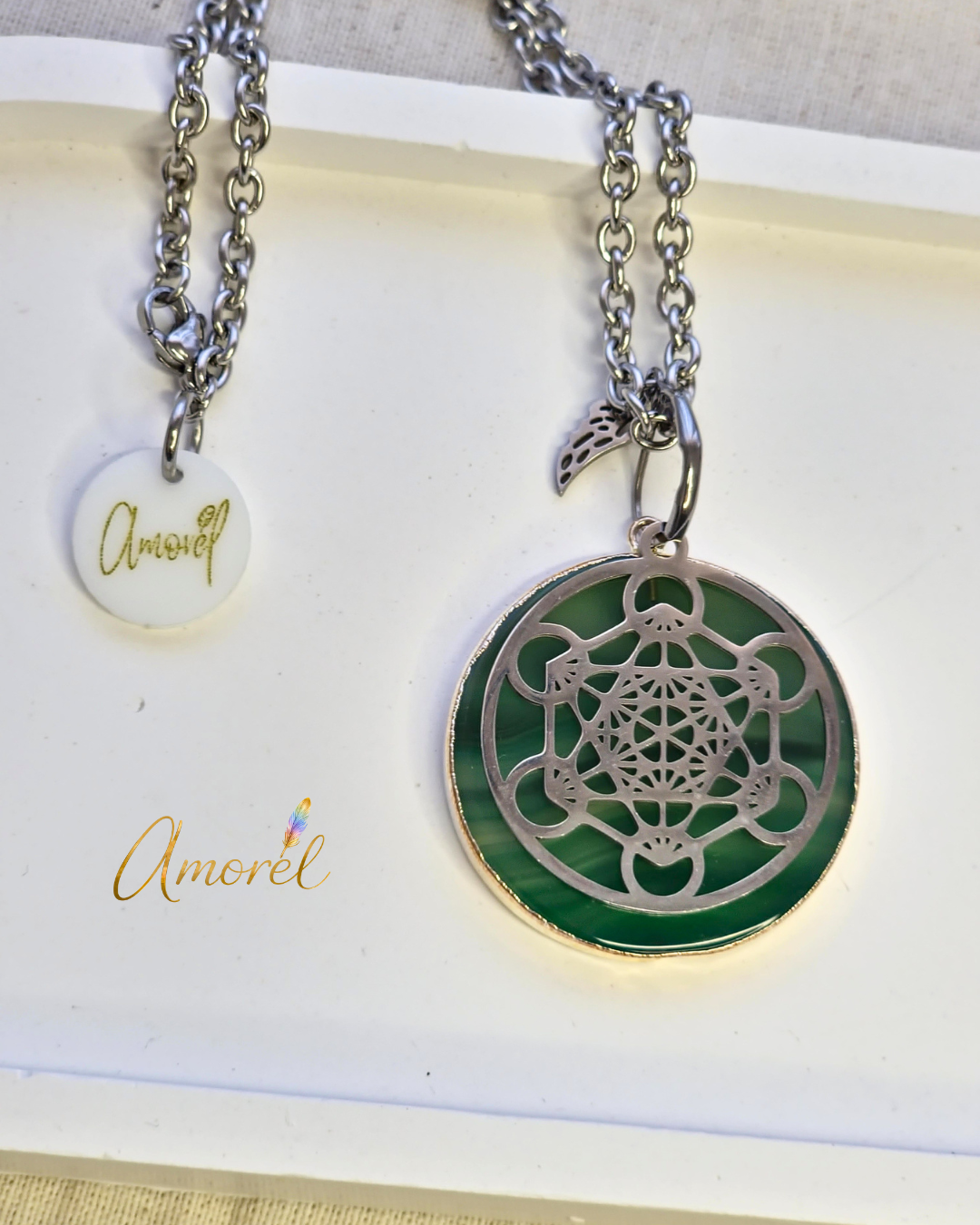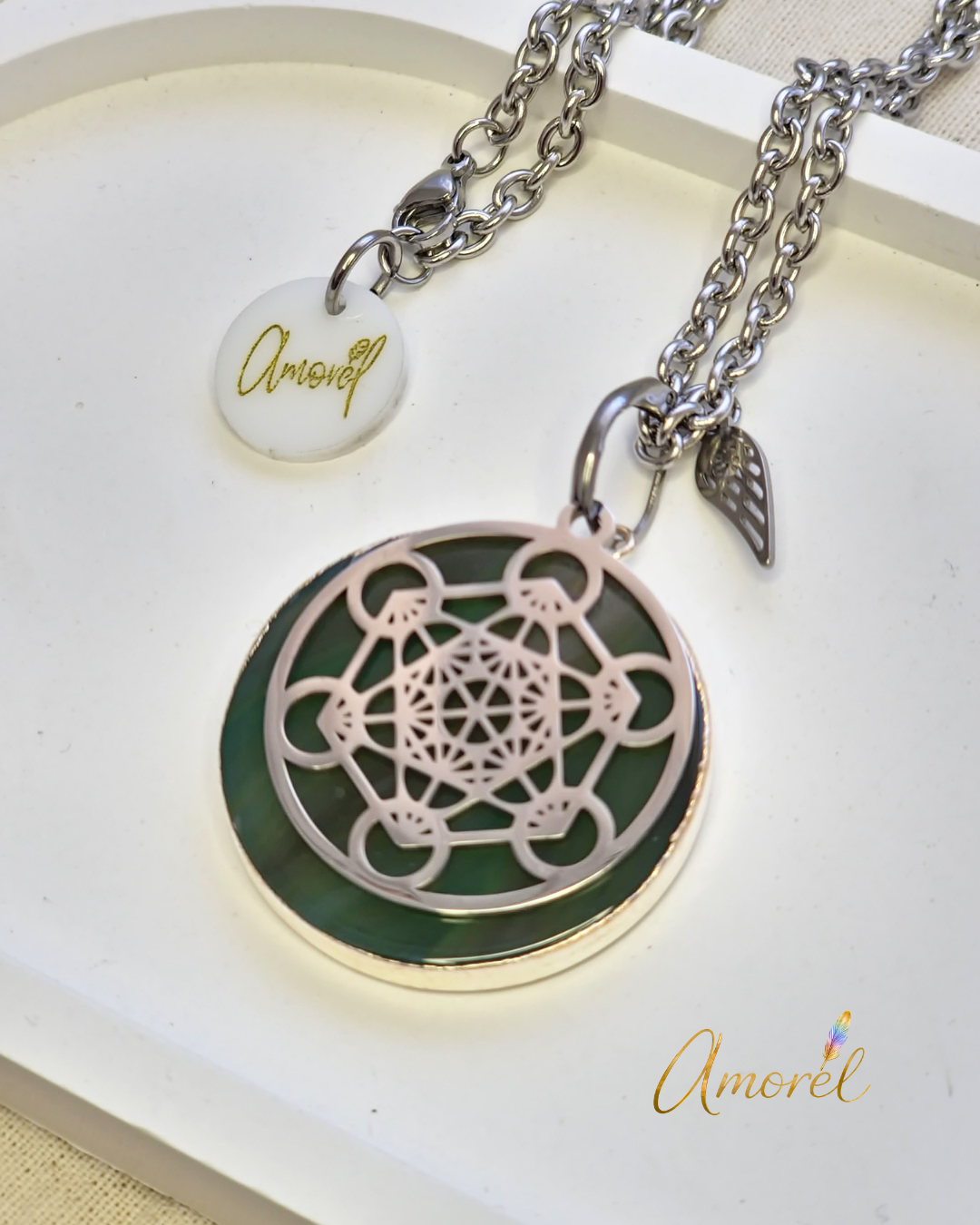 Utilizamos materiales de calidad para su composición: cadena de acero, alita de acero, accesorios de acero, y las piedras en este modelo son Ágatas naturales con baño de plata en el borde. Cada pieza incluye también un dije con el lo de Amorél.